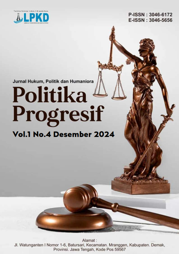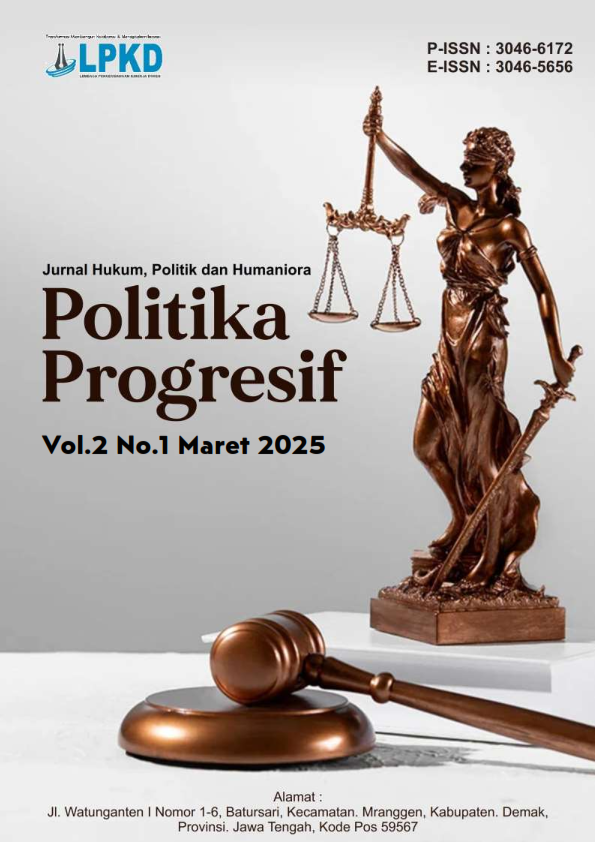 Politika Progresif : Jurnal Hukum, Politik dan Humaniora adalah jurnal yang ditujukan untuk publikasi artikel ilmiah yang diterbitkan oleh Lembaga Pengembangan Kinerja Dosen, Lembaga Penelitian dan Pengabdian Masyarakat Lembaga Pengembangan Kinerja Dosen. Jurnal ini adalah Jurnal Hukum, Politik dan Humaniora yang bersifat peer-review dan terbuka. Bidang kajian dalam jurnal ini termasuk sub rumpun Ilmu Hukum, Ilmu Politik, dan Ilmu Humaniora. Politika Progresif : Jurnal Hukum, Politik dan Humaniora menerima artikel dalam bahasa Inggris dan bahasa Indonesia dan diterbitkan 4 kali setahun: Maret, Juni, September dan Desember. Silakan buat Artikel Template baru lalu kirimkan naskah Anda.